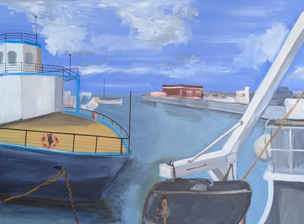 Porto di Fano con barche, 2025, 80×60 cm, mixed media op doek